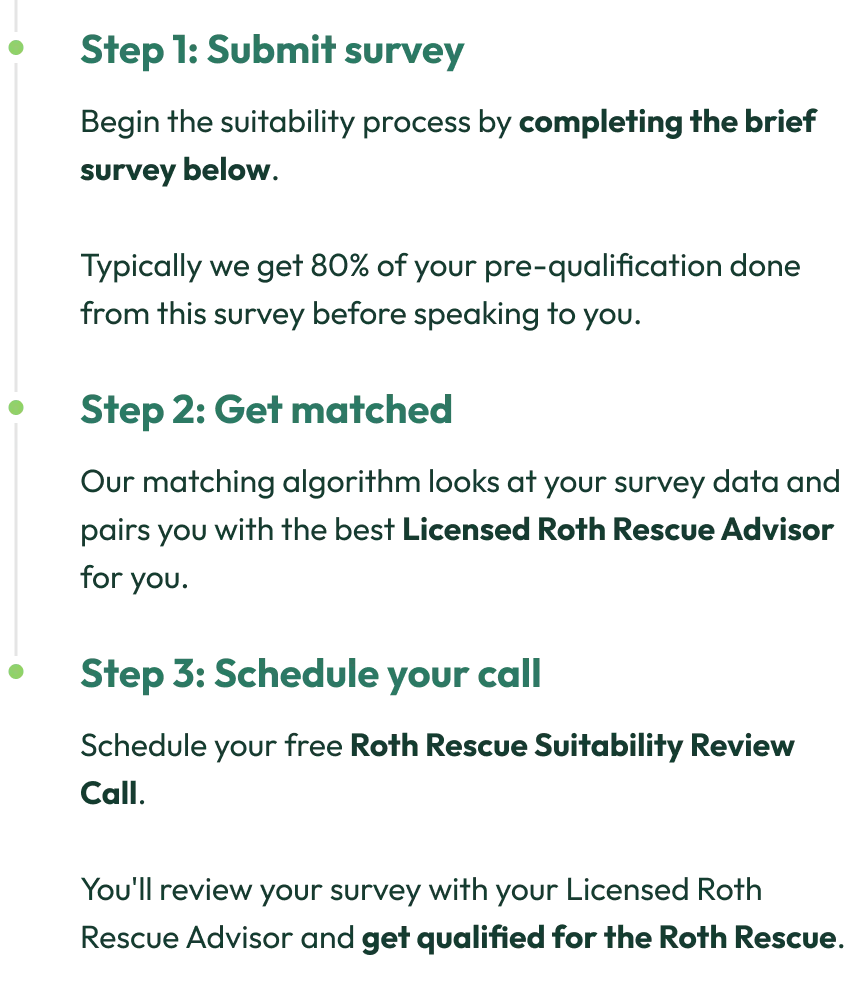 To complete your qualification and provide a customized and personalized Roth Rescue, your Licensed Roth Rescue Advisor will need 5 - 15 minutes so they can determine if a Roth Rescue is suitable for you.